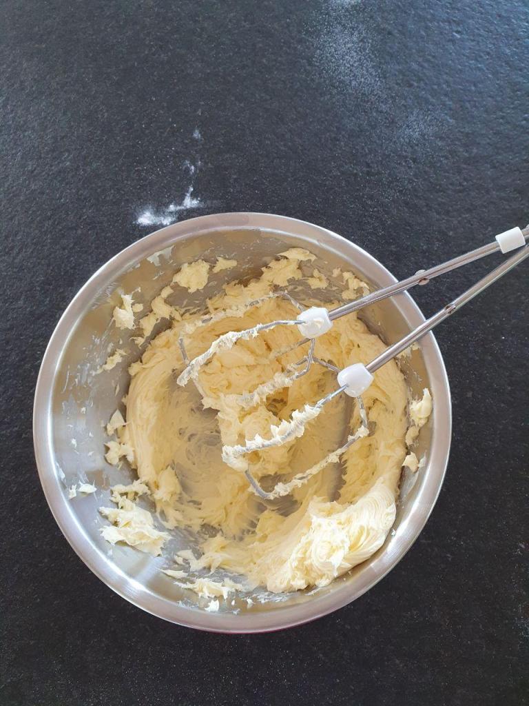 • In der Zwischenzeit Butter verrühren, bis sich kleine Flöckchen gebildet haben oder die Konsistenz cremig weich ist. Dann die Butter am Rand der Schüssel, in der sich die Mehl-Zucker-Mischung befindet, verteilen.